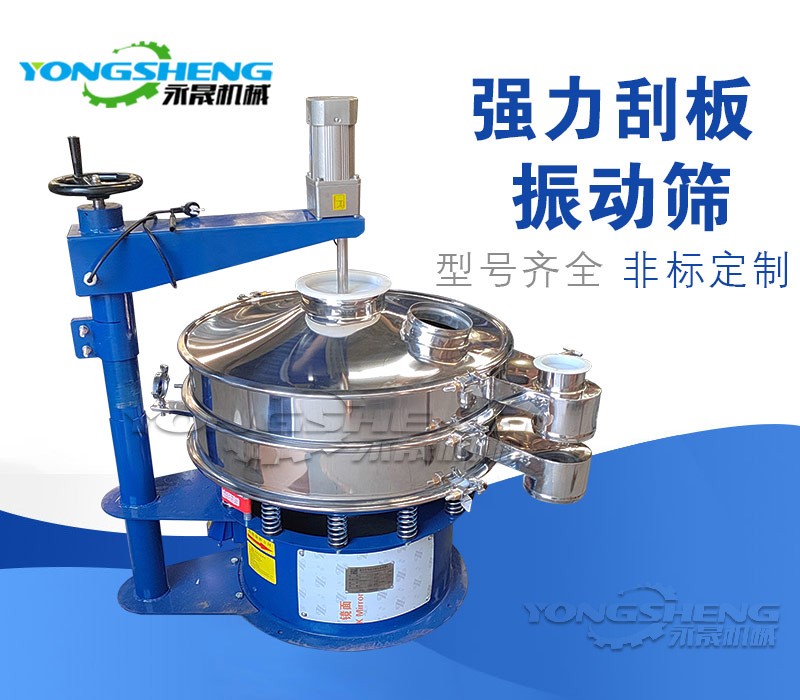 强力刮板振动筛是在圆形振动筛筛面上面新增不锈钢刮板或者毛刷,通过刮板或毛刷给物料一个外力 ,来加速物料通过筛网的筛分速度,来提高振动筛筛分量。还可以将结团物料打散、因静电吸附在筛网上面的物料刮离或者扫离筛面,因而把圆形振动筛的应用范围扩展至易起静电,易团球,易团聚的物料。例如在面粉筛分中,有些细渣子卡在网孔中,在刮板旋转推动的作用下,可以将杂质推向出料口,自动排出,减少了堵网的发生;在固液分离作业中,能把各类浆液中的非溶性物质迅速地清除从出料口排出,防止堵网,提高筛分效率。